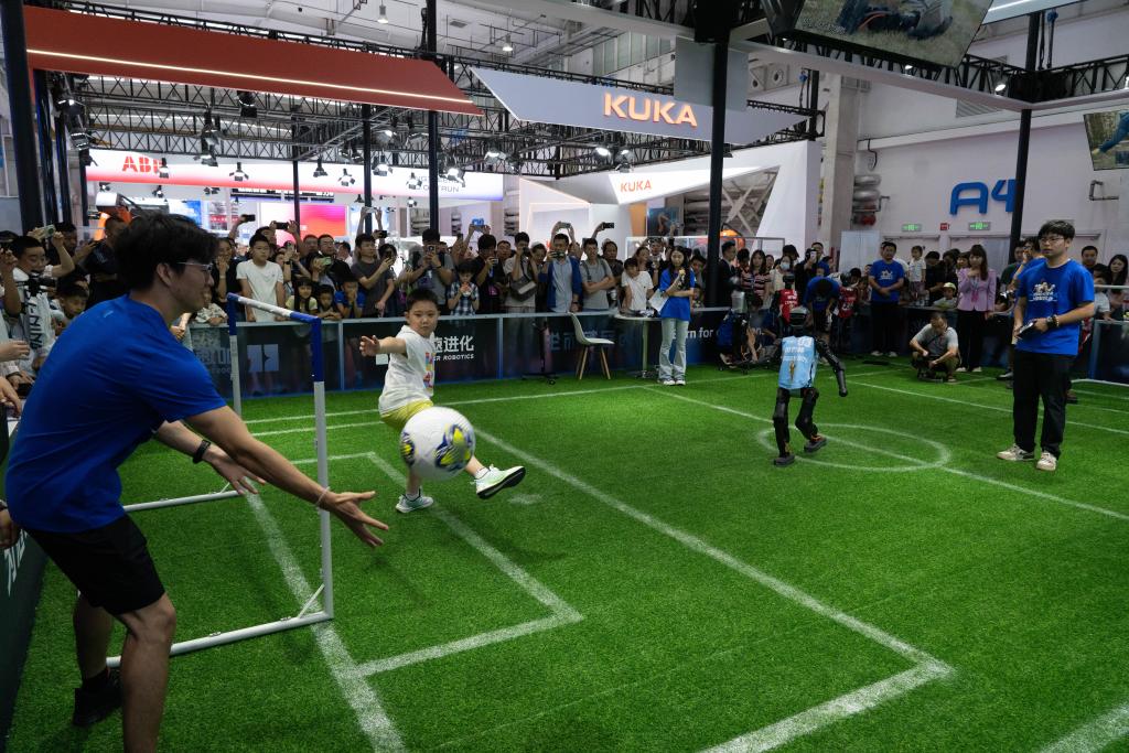 8月8日,觀眾在2025世界機(jī)器人大會上與機(jī)器人踢足球。新華社記者謝晗攝
