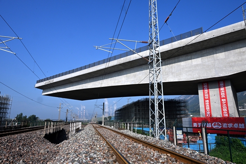 這是8月11日拍攝的河南省濟(jì)源市沿太行山高速公路跨焦柳鐵路立交橋轉(zhuǎn)體施工現(xiàn)場。