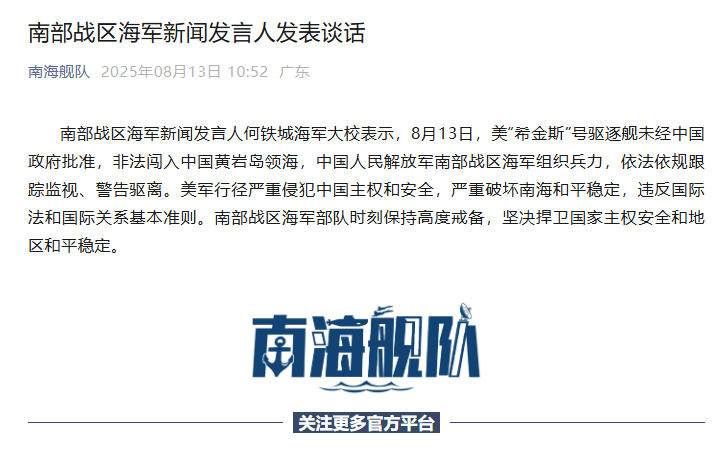 中國(guó)網(wǎng)8月13日訊 據(jù)“南海艦隊(duì)”微信公眾號(hào)消息,南部戰(zhàn)區(qū)海軍新聞發(fā)言人何鐵城海軍大校表示,8月13日,美“希金斯”號(hào)驅(qū)逐艦未經(jīng)中國(guó)政府批準(zhǔn),非法闖入中國(guó)黃巖島領(lǐng)海,中國(guó)人民解放軍南部戰(zhàn)區(qū)海軍組織兵力,依法依規(guī)跟蹤監(jiān)視、警告驅(qū)離。美軍行徑嚴(yán)重侵犯中國(guó)主權(quán)和安全,嚴(yán)重破壞南海和平穩(wěn)定,違反國(guó)際法和國(guó)際關(guān)系基本準(zhǔn)則。南部戰(zhàn)區(qū)海軍部隊(duì)時(shí)刻保持高度戒備,堅(jiān)決捍衛(wèi)國(guó)家主權(quán)安全和地區(qū)和平穩(wěn)定。
