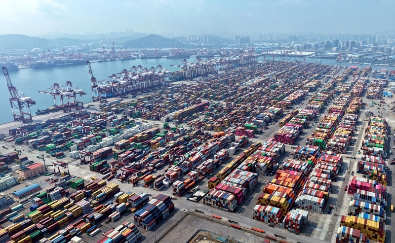 這是8月19日拍攝的山東港口青島港前灣港區(qū)海鐵聯(lián)運(yùn)中心堆場(無人機(jī)照片)。