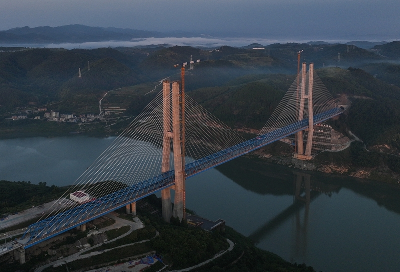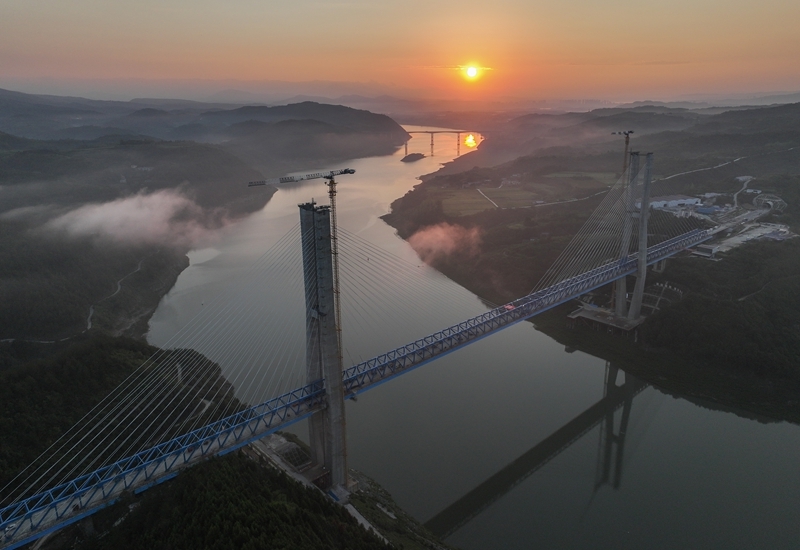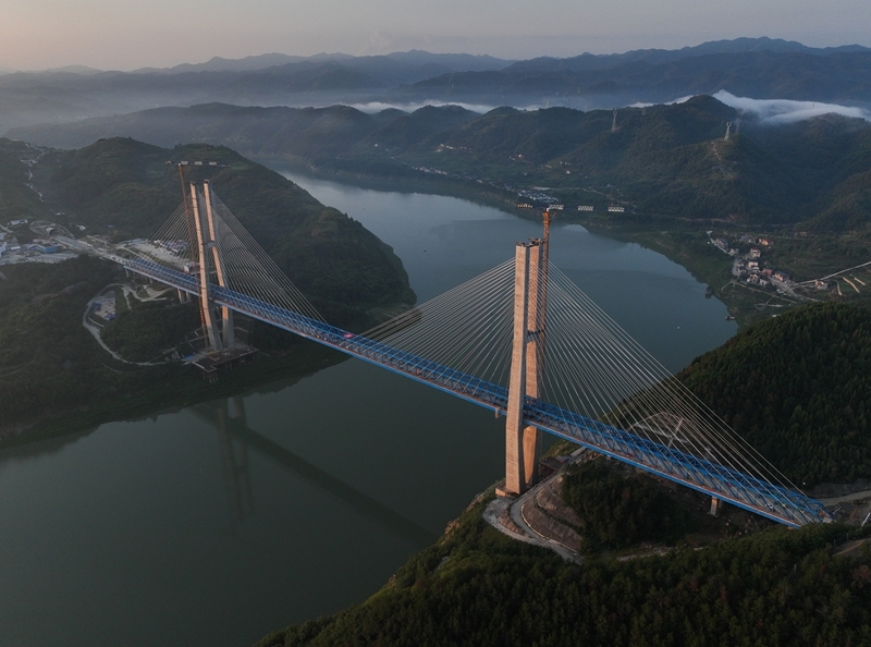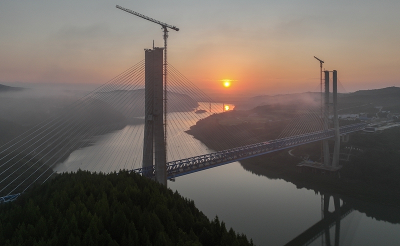 8月18日,由中鐵十一局承建的西安至十堰高速鐵路(簡(jiǎn)稱(chēng)“西十高鐵”)漢江特大橋鋼桁梁順利合龍。漢江特大橋位于湖北省十堰市,跨越丹江口水庫(kù)庫(kù)區(qū),是西十高鐵全線控制性工程,全長(zhǎng)917.45米,主跨420米。本次合龍的鋼桁梁全長(zhǎng)840米、寬11米、高9.4米,采用漸變?nèi)氰焓浇Y(jié)構(gòu),最重桁節(jié)36.4噸。