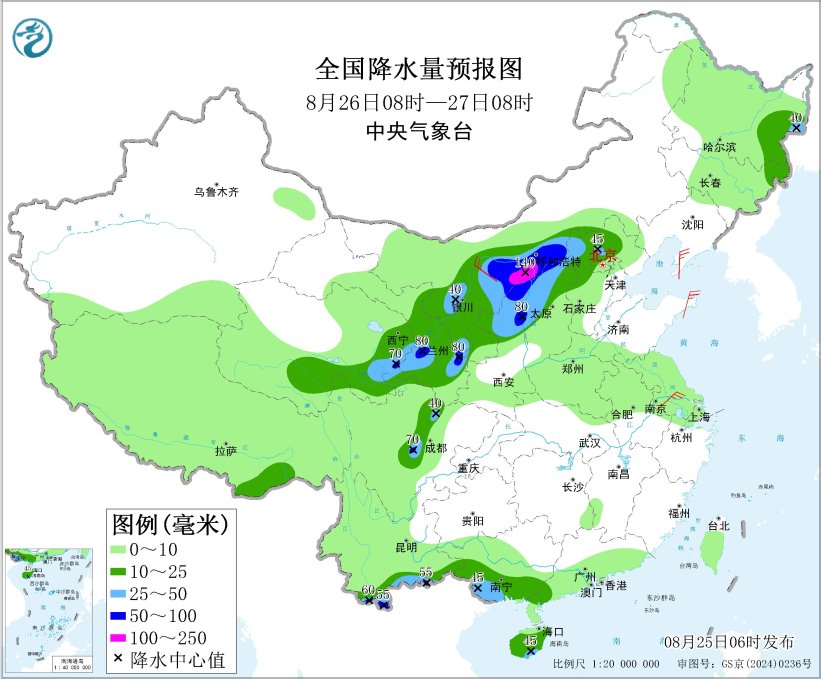 8月26日8時至27日8時,青海東部和南部、甘肅中東部、寧夏、陜西北部、內(nèi)蒙古中西部、山西中北部、河北西北部、北京西部和北部、四川盆地西部、云南南部、廣西南部、海南島等地的部分地區(qū)有中到大雨,其中,青海東南部、甘肅東部、陜西西北部、內(nèi)蒙古中部、山西北部、云南南部等地的部分地區(qū)有暴雨,局地大暴雨(100~140毫米)。內(nèi)蒙古西部、遼東半島、山東半島等地部分地區(qū)有4~5級風(fēng)。