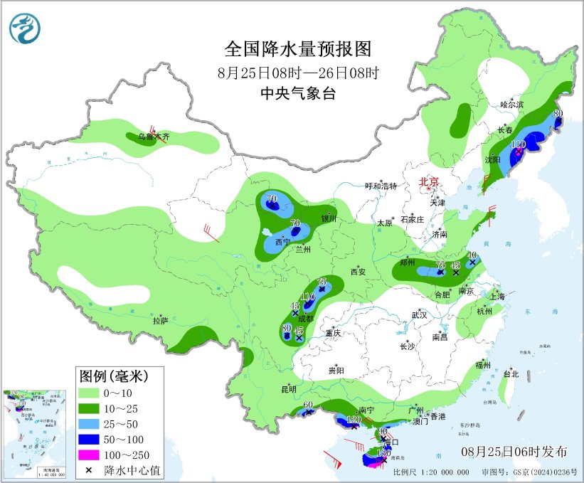 預(yù)計,8月25日8時至26日8時,青海東部、甘肅中部、黑龍江東南部、吉林東部、遼寧東部、河南東部、蘇皖中北部、四川盆地西部和北部、云南東南部、廣西南部、廣東西南部沿海、海南島大部等地部分地區(qū)有大到暴雨,其中,吉林東南部、四川盆地西北部、廣西南部沿海、海南島南部等地部分地區(qū)有大暴雨(100~130毫米)。上述部分地區(qū)伴有短時強(qiáng)降水(最大小時降雨量20~60毫米,局地可超過80毫米),局地有雷暴大風(fēng)等強(qiáng)對流天氣。中央氣象臺8月25日6時發(fā)布暴雨藍(lán)色預(yù)警。