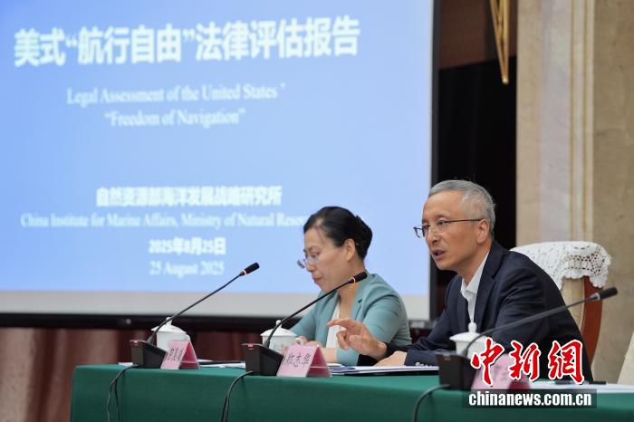 8月25日,中國(guó)自然資源部海洋發(fā)展戰(zhàn)略研究所在北京發(fā)布《美式“航行自由”法律評(píng)估報(bào)告》中英文版。該《報(bào)告》旨在對(duì)美國(guó)“航行自由”相關(guān)主張和實(shí)踐是否符合國(guó)際條約和一般國(guó)際法、是否具備法律基礎(chǔ)進(jìn)行評(píng)估。圖為上海交通大學(xué)日本研究中心副教授鄭志華(右)答記者問(wèn)。中新社記者 張祥毅 攝