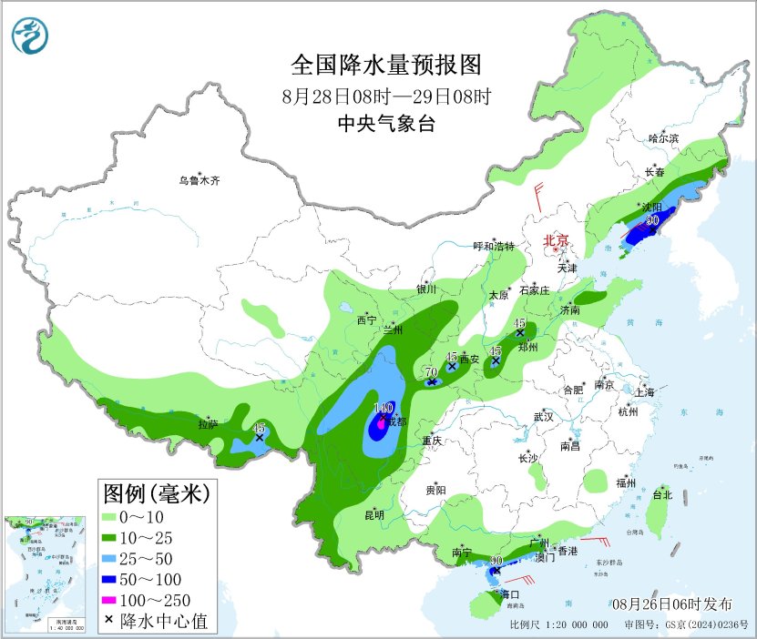 8月28日08時(shí)至29日08時(shí),吉林東部、遼寧中東部、甘肅南部、寧夏、陜西、山東北部、河南北部和西部、四川盆地西部、川西高原、云南西部、西藏南部、廣東西南部、廣西南部、海南島等地的部分地區(qū)有中到大雨,其中,遼寧東部和南部、陜西南部、四川盆地西部、廣東西南部等地的部分地區(qū)有暴雨,局地大暴雨(100~140毫米)。內(nèi)蒙古中東部、遼東半島、山東半島等地的部分地區(qū)有4~6級(jí)風(fēng)。渤海有6~7級(jí)、陣風(fēng)8級(jí)的東北風(fēng),黃海北部海域有5~7級(jí)、陣風(fēng)8級(jí)的偏南風(fēng),南海東北部海域有5~7級(jí)、陣風(fēng)8級(jí)的偏東風(fēng)。