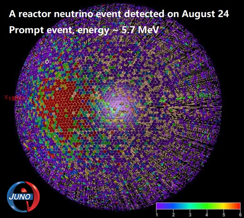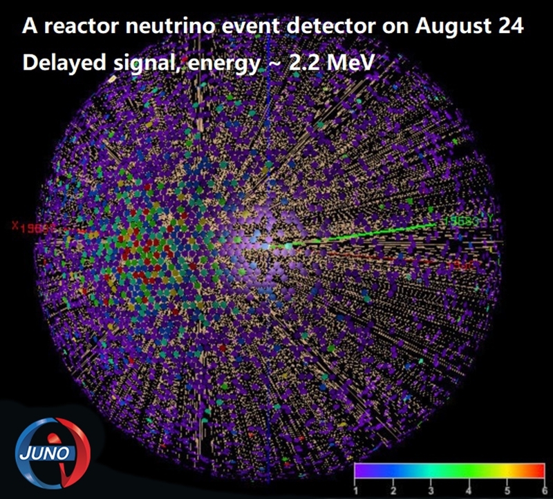 這是8月24日江門中微子實(shí)驗(yàn)探測(cè)到的一個(gè)反應(yīng)堆中微子事例示意圖。