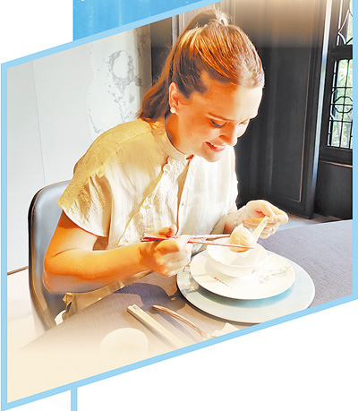 “我要蝦餃、糖沙翁……”瑞秋點(diǎn)了滿滿一桌的點(diǎn)心。不一會(huì)兒,精致的廣式點(diǎn)心端上桌,她拿起筷子,夾住一塊裹滿白色糖霜的黃色糖沙翁,咬了一口。“味道很像甜甜圈,香甜可口!”