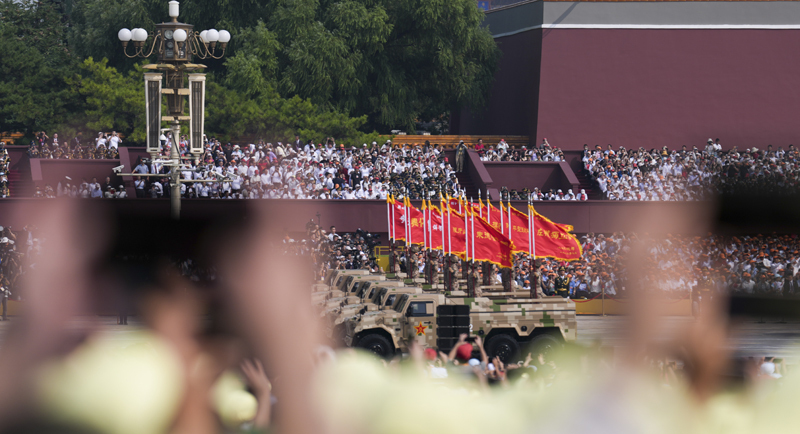 9月3日,紀(jì)念中國人民抗日戰(zhàn)爭暨世界反法西斯戰(zhàn)爭勝利80周年大會在北京隆重舉行。這是戰(zhàn)旗方隊通過天安門廣場。