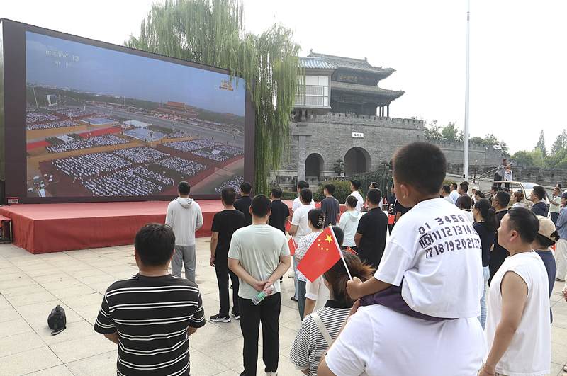 9月3日,游客在山東省棗莊市臺(tái)兒莊古城西門觀看紀(jì)念中國(guó)人民抗日戰(zhàn)爭(zhēng)暨世界反法西斯戰(zhàn)爭(zhēng)勝利80周年大會(huì)直播。