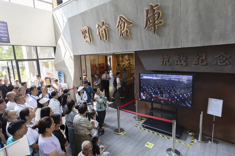 9月3日,市民在上海四行倉(cāng)庫(kù)抗戰(zhàn)紀(jì)念館觀看紀(jì)念中國(guó)人民抗日戰(zhàn)爭(zhēng)暨世界反法西斯戰(zhàn)爭(zhēng)勝利80周年大會(huì)直播。