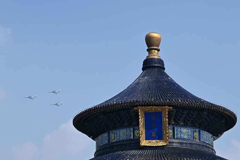 9月3日,紀(jì)念中國人民抗日戰(zhàn)爭暨世界反法西斯戰(zhàn)爭勝利80周年大會(huì)在北京隆重舉行。這是在北京天壇公園拍攝的轟炸機(jī)梯隊(duì)。