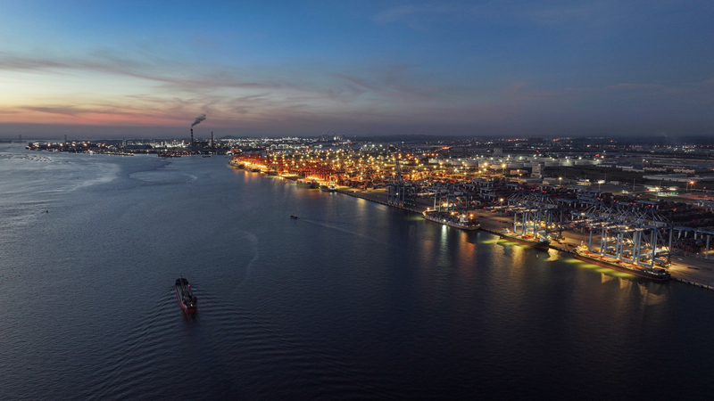正在進行晚間作業(yè)的欽州港碼頭(9月4日攝,無人機照片)。