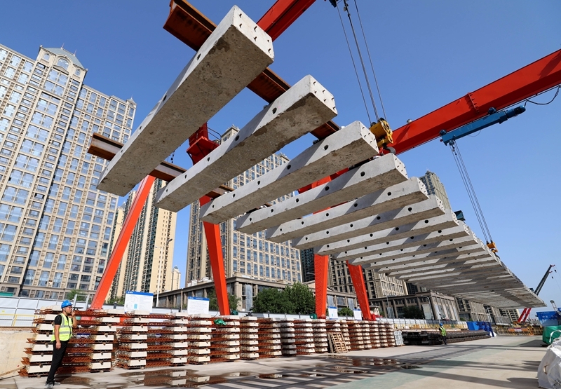 9月7日,工人在石家莊地鐵4號線一期工程東垣東路站建設(shè)工地施工。