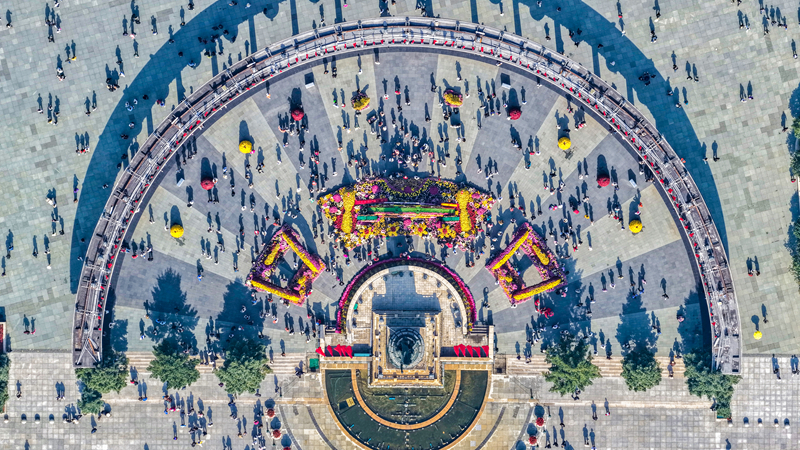 10月2日,游客在黑龍江省哈爾濱市防洪勝利紀念塔廣場游玩(無人機照片)。