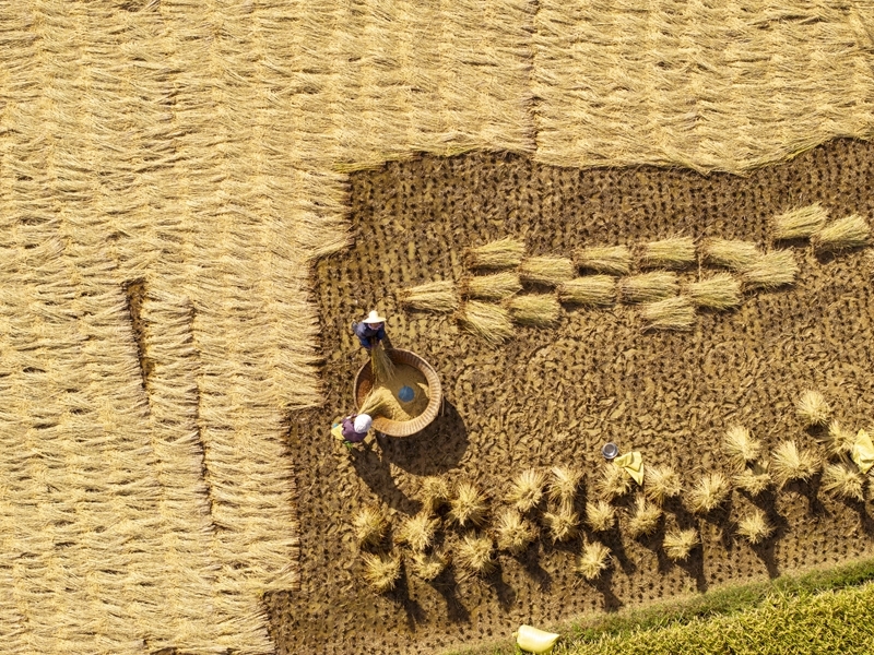 10月3日,農(nóng)民在云南省大理白族自治州洱源縣右所鎮(zhèn)收割水稻(無人機(jī)照片)。