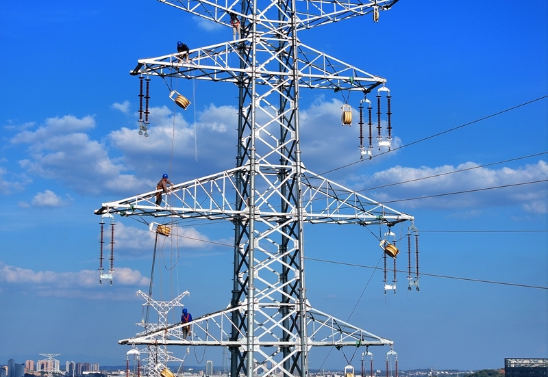 10月3日,在湖南省衡陽市雁峰區(qū)岳屏鎮(zhèn),施工人員在真武-麻塘220千伏線路改造工程項(xiàng)目開展架線施工作業(yè) (無人機(jī)照片)。