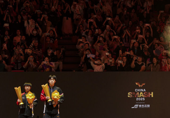 10月3日,在北京舉行的2025年世界乒乓球職業(yè)大聯(lián)盟(WTT)中國(guó)大滿(mǎn)貫賽混合雙打決賽后,冠軍中國(guó)組合王楚欽(右)/孫穎莎在頒獎(jiǎng)儀式上。新華社記者 鞠煥宗 攝