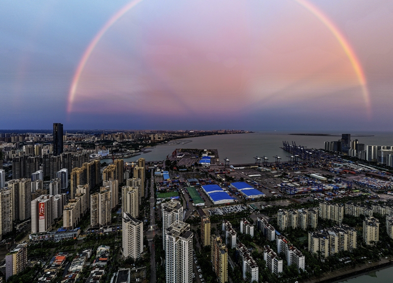 10月6日清晨,??谑猩峡粘霈F彩虹。今年第21號臺風“麥德姆”對??诘挠绊戁呌诮Y束,??诔菂^(qū)逐步恢復正常秩序。