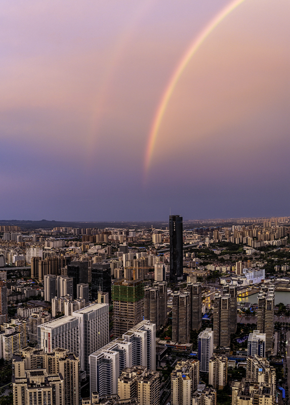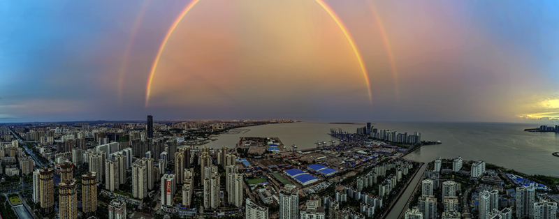 10月6日清晨,海口市上空出現彩虹。今年第21號臺風“麥德姆”對??诘挠绊戁呌诮Y束,海口城區(qū)逐步恢復正常秩序。