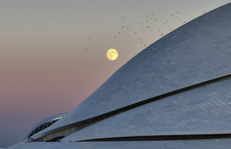 10月6日在黑龍江省哈爾濱大劇院拍攝的中秋滿月(無人機照片)。