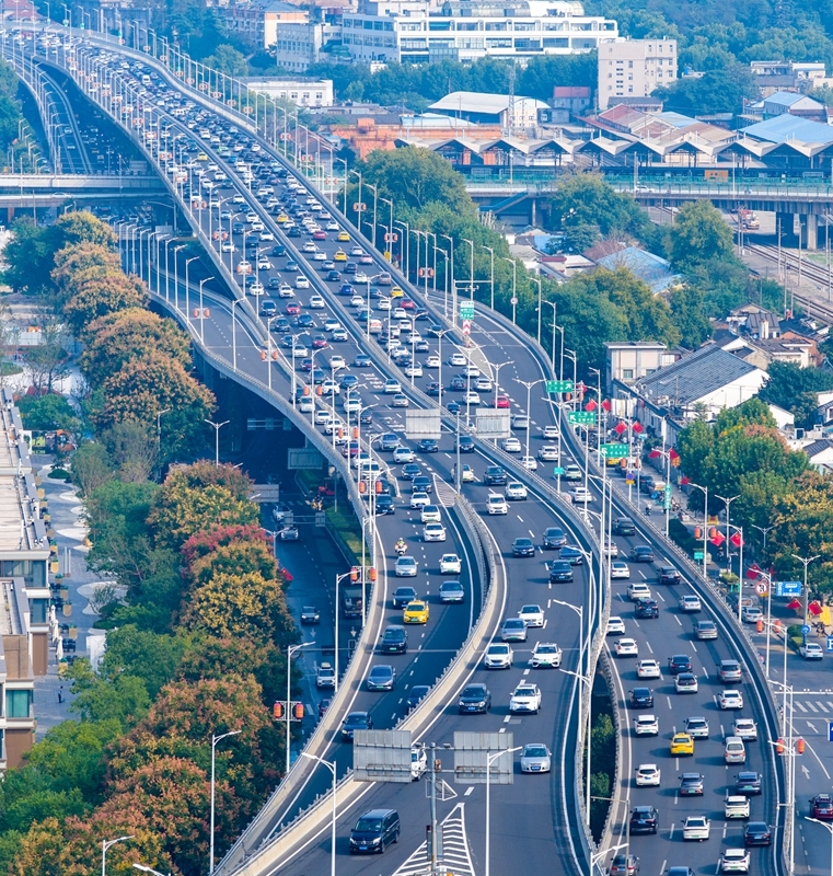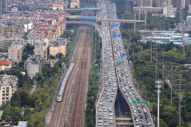 10月7日,車輛行駛在江蘇省南京市應天高架上(無人機照片)。