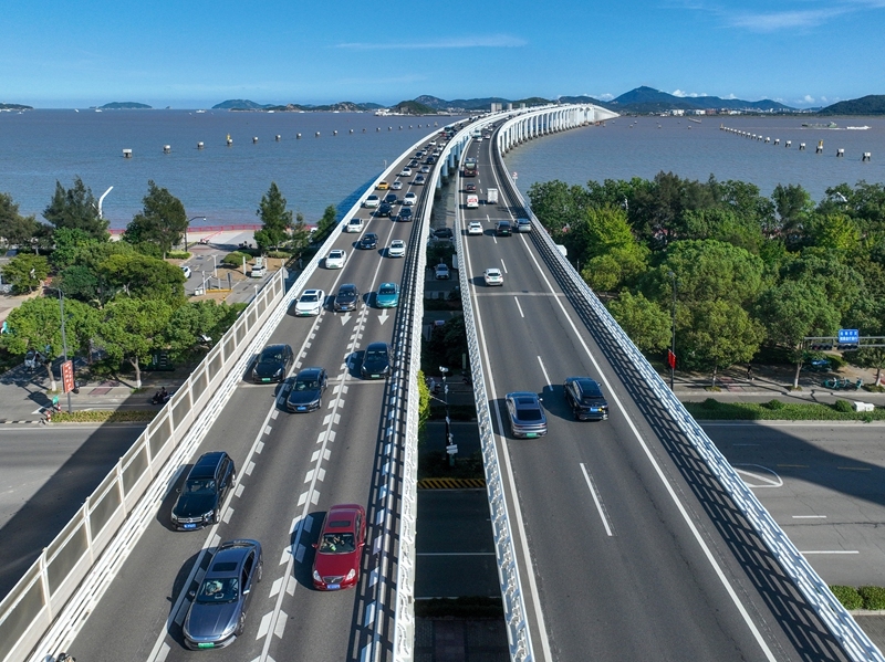 10月7日,在浙江省舟山市普陀區(qū),車輛行駛在朱家尖海峽大橋上(無人機照片)。