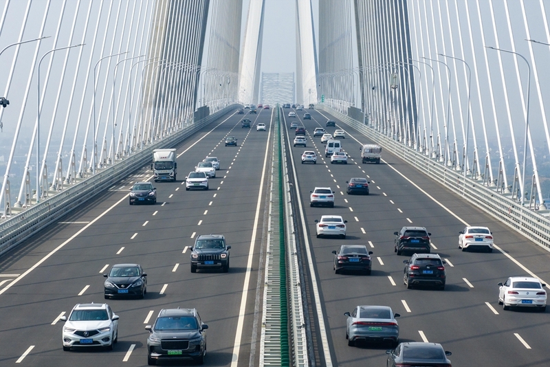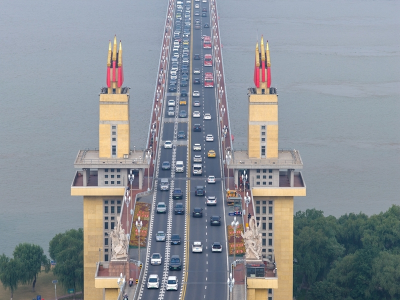 10月7日拍攝的南京長江大橋上的車流(無人機(jī)照片)。