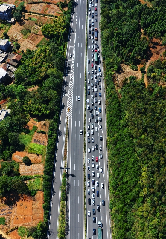 10月7日,車輛在許廣高速湖南省郴州市嘉禾縣路段緩慢行駛(無人機(jī)照片)。