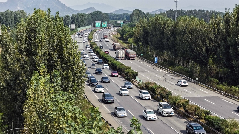 10月7日在河北省遵化市境內(nèi)拍攝的承唐高速公路車流(無人機(jī)照片)。
