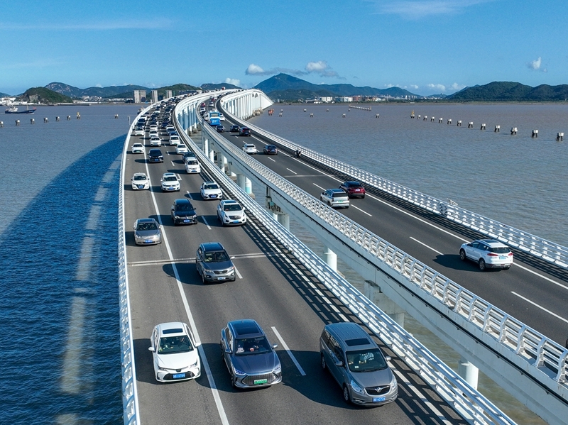 10月7日,在浙江省舟山市普陀區(qū),返程車輛行駛在朱家尖海峽大橋上(無人機(jī)照片)。
