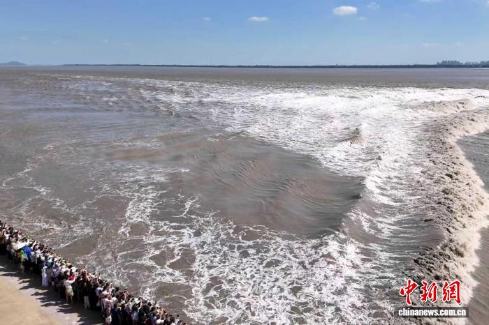 中新網(wǎng)嘉興10月9日電(胡豐盛 孫楊洋)10月9日,農(nóng)歷八月十八,被譽(yù)為“天下第一潮”的錢塘江大潮如期而至,數(shù)萬(wàn)中外游客齊聚浙江海寧鹽官觀潮點(diǎn),共賞這一自然奇觀。