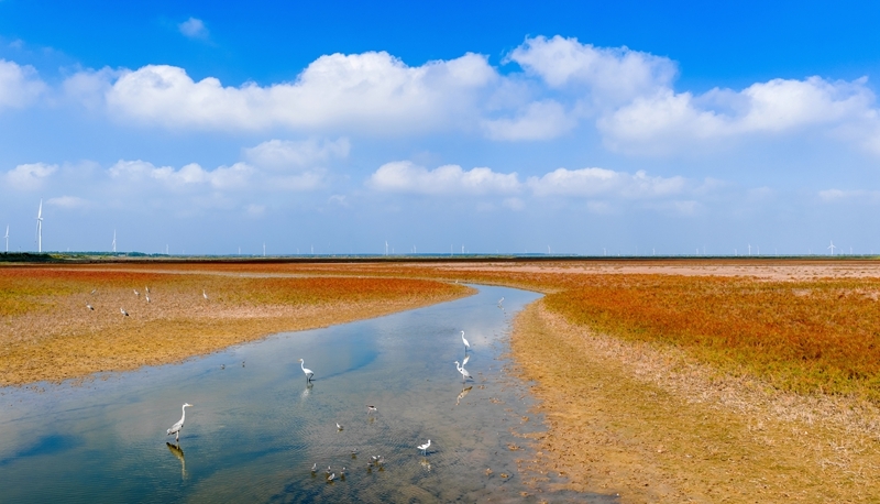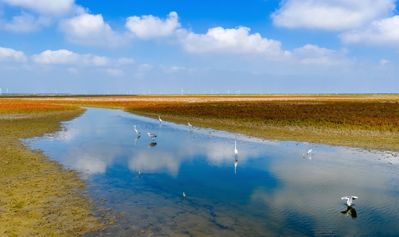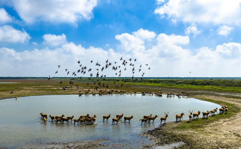 10月11日,在江蘇東臺條子泥濕地,候鳥飛翔,成群野生麋鹿悠閑散步,一派人與自然和諧共生的生態(tài)美景(無人機照片)。