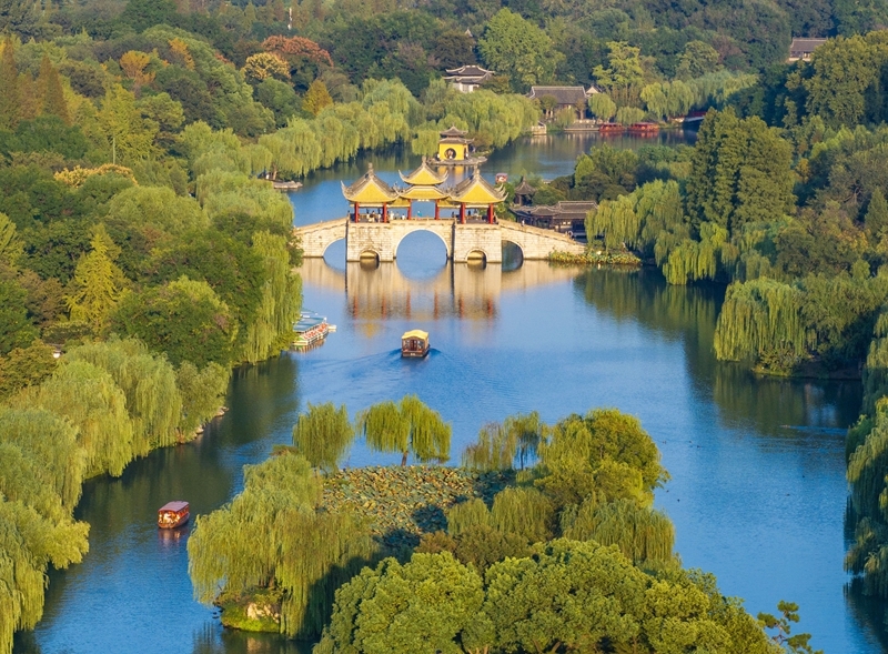 10月9日,游客在江蘇揚州瘦西湖風景區(qū)游玩賞秋(無人機照片)。