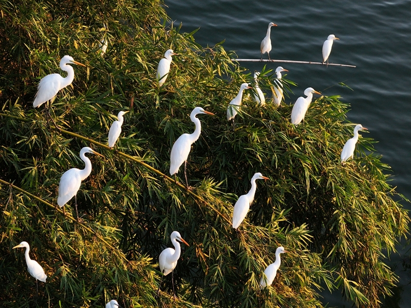 10月9日,白鷺在廣西昭平桂江國家濕地公園的江邊竹林小憩(無人機照片)。