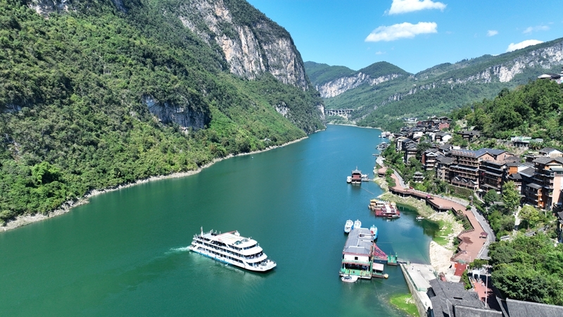 10月9日拍攝的重慶市酉陽土家族苗族自治縣龔灘古鎮(zhèn):鱗次櫛比的土家吊腳樓與一江碧水、絕壁峽谷和往來船只構成一幅山水畫卷(無人機照片)。