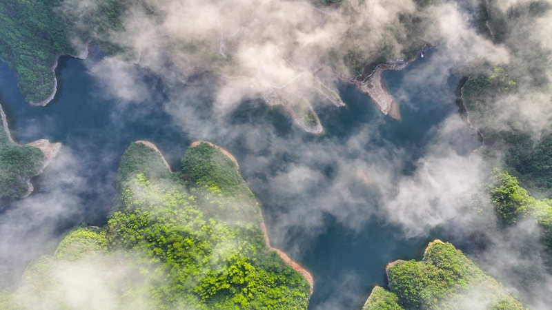 10月8日拍攝的貴州省銅仁市石阡縣楓香鄉(xiāng)鴛鴦湖日出云霧景觀(無人機照片)。