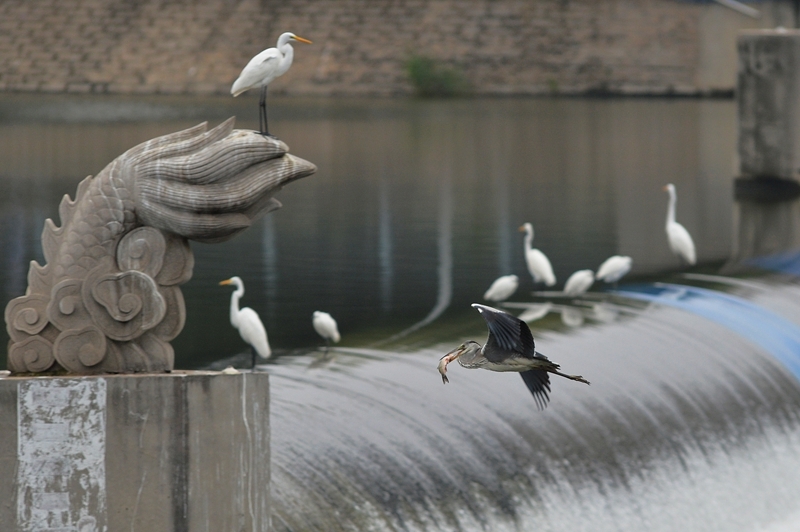 10月11日,在山東省青島市城陽區(qū)白沙河濕地,一只蒼鷺捕魚后飛過橡膠壩。
