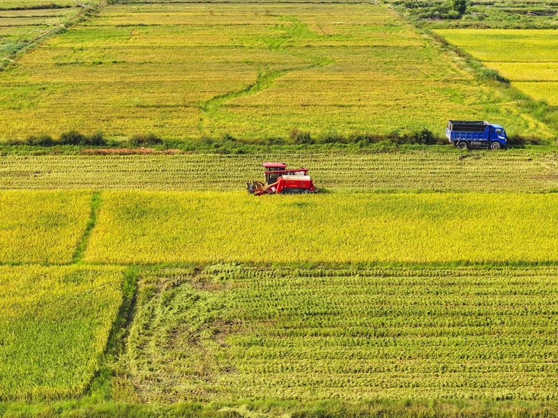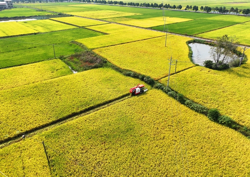 10月11日,湖南省衡陽(yáng)市衡山縣白果鎮(zhèn)村民駕駛農(nóng)機(jī)收割稻谷(無(wú)人機(jī)照片)。
