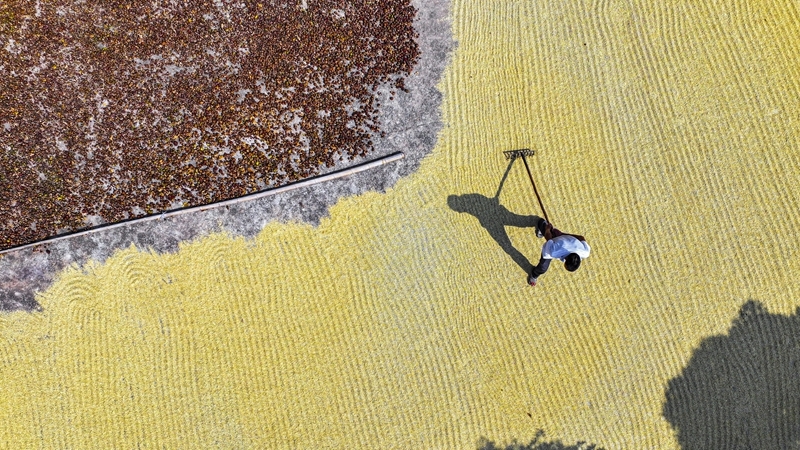 10月11日,湖南省常寧市蘭江鄉(xiāng)農(nóng)民在晾曬稻谷(無(wú)人機(jī)照片)。
