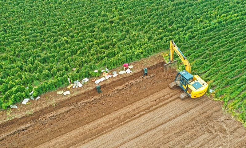 10月11日,河南省焦作市孟州市城伯鎮(zhèn)西后津村農(nóng)民在田間搶收鐵棍山藥(無(wú)人機(jī)照片)。