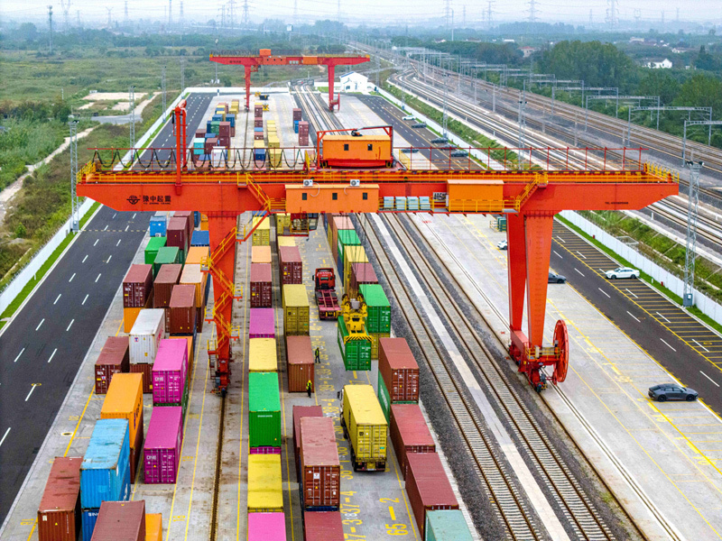 10月13日,在江蘇省揚(yáng)州市江都商貿(mào)物流園鐵路物流基地,大型起重設(shè)備在起吊集裝箱,這些集裝箱將通過(guò)海鐵聯(lián)運(yùn)列車(chē)發(fā)往上海蘆潮港準(zhǔn)備出口(無(wú)人機(jī)照片)。