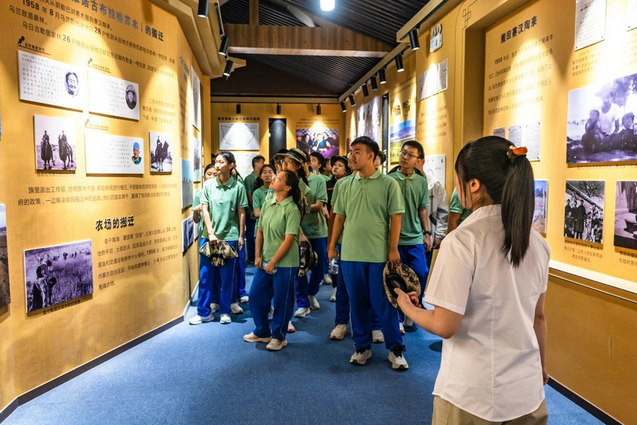 在寶日烏拉黨政機關舊址,同學們聆聽講解,了解“最好牧場為航天”的感人往事, 感受老一輩建設者們在風沙中對祖國的赤誠。烏海市第十中學胡林濤說:“聽了‘最好牧場為航天’的故事,我真正懂得了什么是舍小家為國家。他們帶著牲畜離開世代生活的牧場,沒有一句抱怨,眼里只有對國家的支持,這種家國情懷太打動人了,以后我也要把這份擔當記在心里,努力成為對國家有用的人?!?/p>