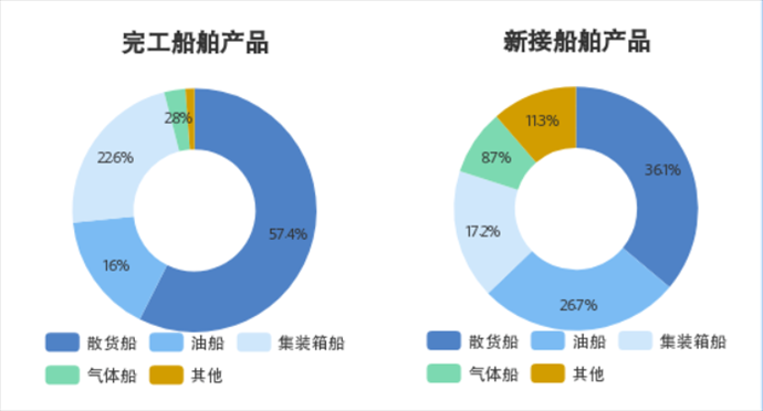 具體來(lái)看,在1—3月新接船舶產(chǎn)品訂單結(jié)構(gòu)中,占比最高的散貨船為36.1%,油船占比26.7%,集裝箱船占比17.2%,氣體船占比8.7%。在完工船舶產(chǎn)品結(jié)構(gòu)中,散貨船占比57.4%,集裝箱船占比22.6%,油船占比16%,氣體船占比2.8%。
