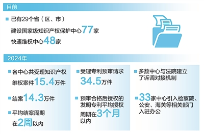 保護知識產(chǎn)權(quán)就是保護創(chuàng)新。中共中央、國務(wù)院印發(fā)的《知識產(chǎn)權(quán)強國建設(shè)綱要(2021—2035年)》提出,“建立完善知識產(chǎn)權(quán)仲裁、調(diào)解、公證、鑒定和維權(quán)援助體系”。目前,已有29個省(區(qū)、市)建設(shè)國家級知識產(chǎn)權(quán)保護中心77家、快速維權(quán)中心48家。