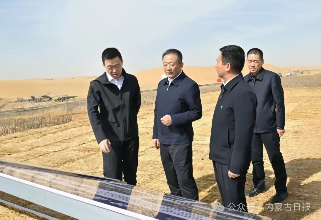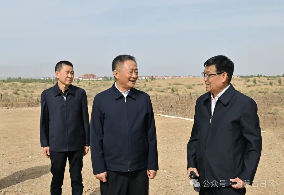 5月11日,自治區(qū)黨委書記孫紹騁在杭錦旗獨貴塔拉鎮(zhèn)沙日召嘎查重點了解庫布其沙漠北緣鎖邊林草帶布局和入黃泥沙減少、生態(tài)用水保障等情況。草原云·內(nèi)蒙古新聞網(wǎng)記者