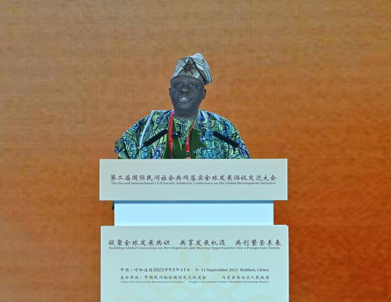 9月10日,貝寧國(guó)民議會(huì)議長(zhǎng)弗拉沃努在第二屆國(guó)際民間社會(huì)共同落實(shí)全球發(fā)展倡議交流大會(huì)開(kāi)幕式上致辭。草原云·內(nèi)蒙古新聞網(wǎng)記者 馬建兵 攝