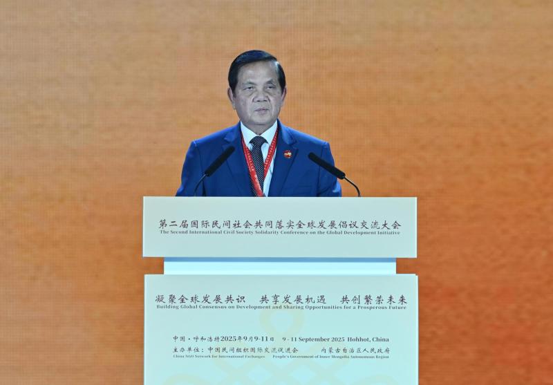9月10日,柬埔寨參議院第一副主席吳波烈在第二屆國(guó)際民間社會(huì)共同落實(shí)全球發(fā)展倡議交流大會(huì)開(kāi)幕式上致辭。草原云·內(nèi)蒙古新聞網(wǎng)記者 馬建兵 攝