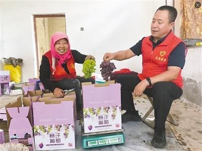 時任賽汗烏素村第一書記孫壽峰(右)幫助村民銷售葡萄。