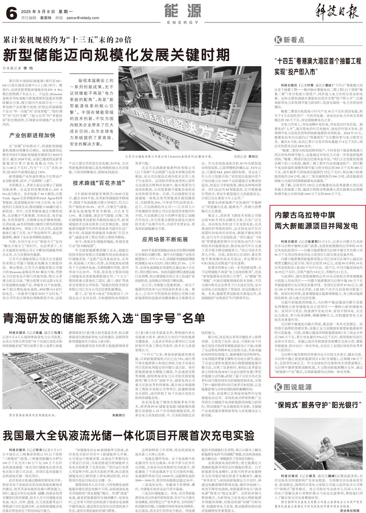 2025年9月8日,《科技日報》第6版整版刊發(fā)題為《內(nèi)蒙古烏拉特中旗兩大新能源項目并網(wǎng)發(fā)電》的文章,報道了記者從內(nèi)蒙古巴彥淖爾市烏拉特中旗相關(guān)部門獲悉,全國首批規(guī)模性應(yīng)用單機10兆瓦風(fēng)電機組項目——內(nèi)蒙古能源集團(tuán)烏拉特中旗甘其毛都口岸50萬千瓦靈活性綠色供電示范項目日前實現(xiàn)全容量并網(wǎng)。